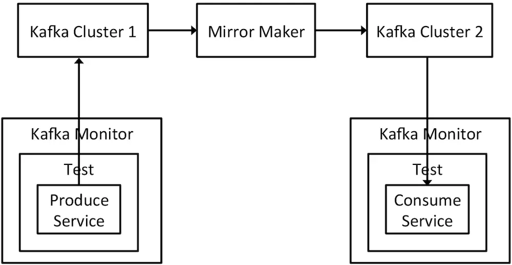 使用多个Kafka Monitor实例进行集群间性能测试 当所有的服务和相同的Kafka Monitor实例必须运行在同一个物理机器上的时候,我们可以启动多个Kafka Monitor 实例在不同的集群, 一起协作完成一个精密控制的端到端测试。在下面这个测试示意图中,我们启动了两个Kafka Monitor 实例在两个集群中。 第一个Kafka Monitor 实例包含一个生产者服务,提供给Kafka 集群1。消息从集群1反射到集群2。 最后,在第二个Kafka Monitor 实例的消费者服务,处理了消息,来自集群2中的同一个主题,并且报告了通过集群通道的端到端时延。