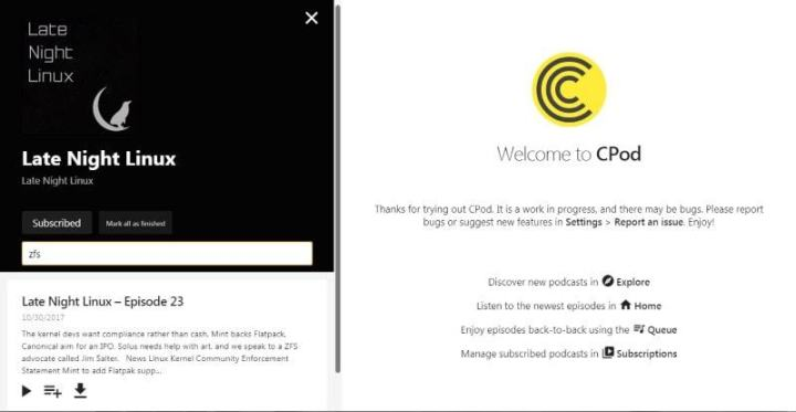 找到播客的特定节目也很容易。例如,我最近在寻找 Late Night Linux 中的一集,这集中他们在谈论 ZFS。我点击播客,在搜索框中输入 “ZFS” 然后找到了它。