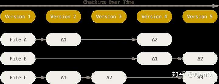 Git 和其它版本控制系统(包括 Subversion 和近似工具)的主要差别在于 Git 对待数据的方法。 概念上来区分,其它大部分系统以文件变更列表的方式存储信息。 这类系统(CVS、Subversion、Perforce、Bazaar 等等)将它们保存的信息看作是一组基本文件和每个文件随时间逐步累积的差异。