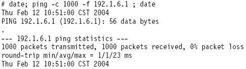 在上面的这个例子中,1秒钟发送了1000个信息包,这个命令使用了IP和网络控制信息协议(ICMP)因而没有涉及到任何传输协议(UDP/TCP)和应用程序,测到的数据,比如往返时间,不会影响到总体的性能特征。