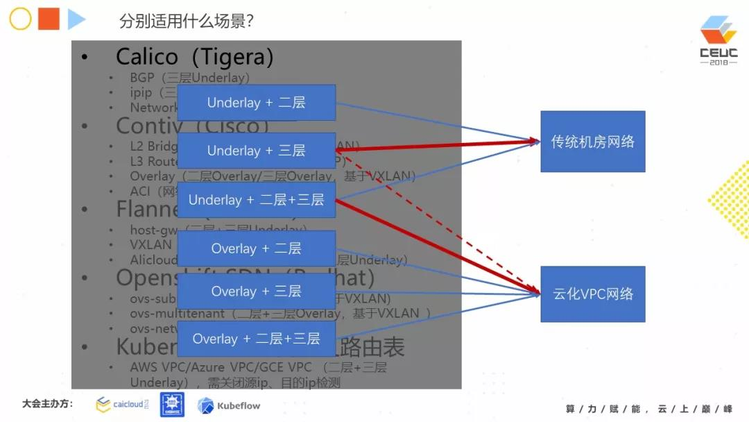红色虚线指向,Underlay + 三层网络在云化 VPC 场景下,也是可以受限使用。受限使用顾名思义,可以使用但不是每个供应商都让你用,因为每一个云厂商对他自己网络保护的定义不一样。比如像 Calico 方案,它的 BGP 在 AWS 中就容易做,但在 Azure 中就不允许,因为 Azure 的 VPC 本身是不允许不受它管控范围的 IP 通过。