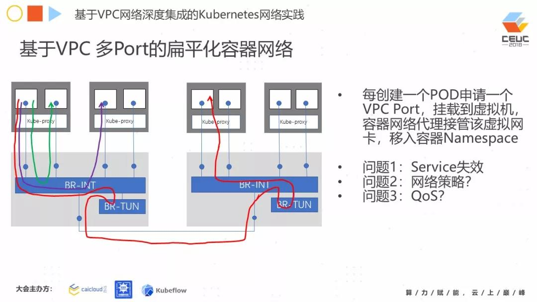 Pod 内部的网络策略是需要自己做,需要跑两套网络策略。第二个问题,QoS 同样如此。就是你端口粒度的 Port, QoS 需要自己做。第三个问题,单虚拟机上 Pod 数量有限制。这是因为 VPC 对于这个端口的 IP 数量有限制,也是就是 Pod 数量有限制。
