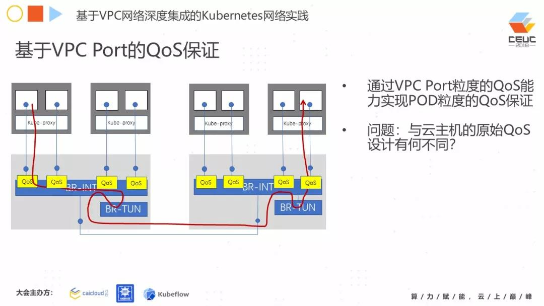 第三种方案:基于 VPC Port 的 QoS 保证。那么你可以在 VPC 的 Port 上,去完成这个 QoS 在每一个 Pod 的类似保证,但是还是一样有问题,就是你怎么去跟这个 IaaS 的整个原始 QoS 设计去协同。