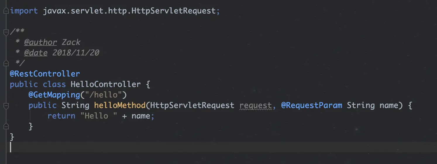 启动项目后,在浏览器里面输入http://localhost:8080/hello?name=Zack。结果返回Hello Zack。