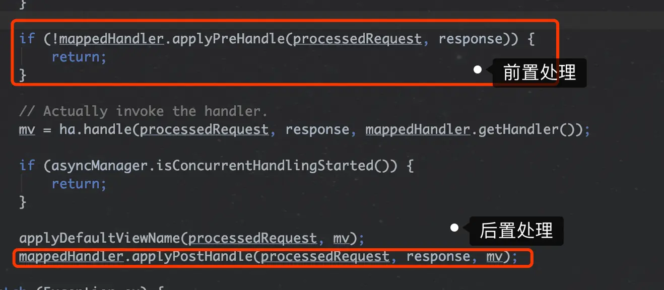 前面提到Handler是被封装在HandlerExecutionChain里面的,其中还包含一些前置后置的拦截器。所以在执行HandlerAdapter.handle()前后会有对HandlerExecutionChain的调用,执行interceptor对前后置处理的方法