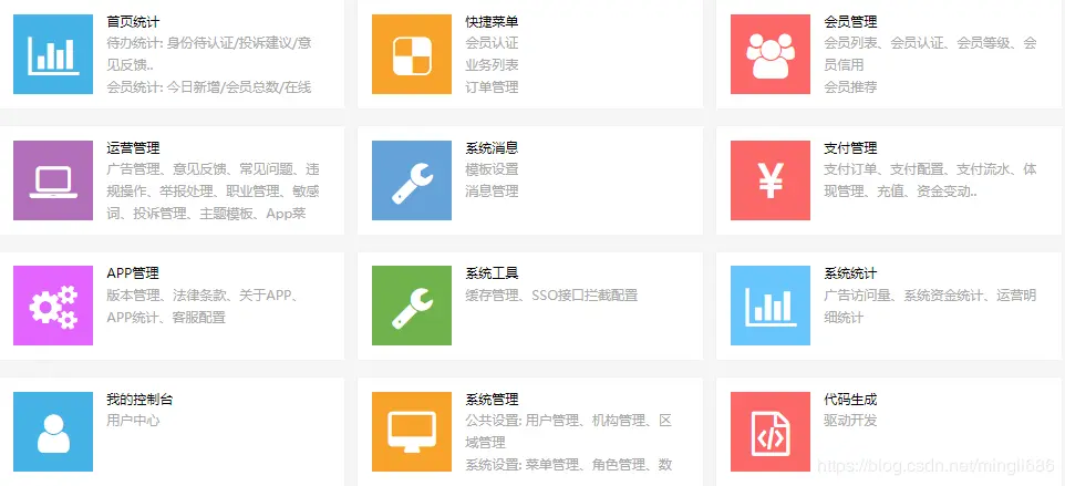 广告管理、意见反馈、常见问题、违规操作、举报处理、职业管理、敏感词、投诉管理、主题模板、App菜单、靓号管理、活动管理、优惠券、红包、分享、资金配置、客服