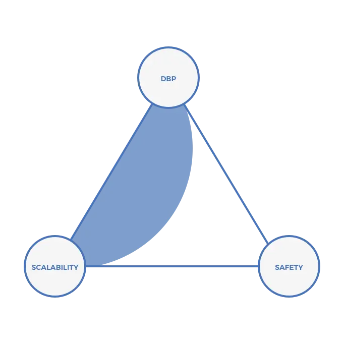 在三难困境中,DPoS 系统会侧重于三角形的底边。请注意:前两幅三角形图解反映的是 TTF 较长的系统的情况,而 DPoS 系统的 TTF 较短,因此用暗色表示。