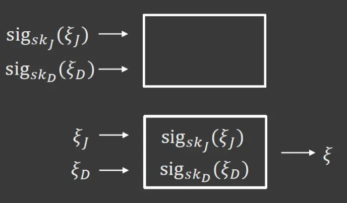 为了防止这种作弊行为,这时候我们引入新的机制:承诺。也就是说,要让Daniel即使知道Jan选择了什么,也不能根据Jan的选择去更改自己的选择。怎么做呢?在第一个承诺阶段,我们先让他们把随机数签名,签名结果输入进协议。在这样的情况下,通过第二个揭示阶段,把签过名的随机数输入进去,与第一个阶段的承诺进行比对成功之后,再异或出结果,获得我们想要的随机数。签名而不采用哈希函数的目的,是为了保证输入的随机数是由本人输入,而不是别人伪造输入的,然而在区块链的设定下,我们可以直接使用哈希函数,因为通常区块链的交易都是带有签名的。