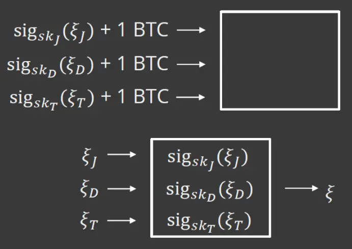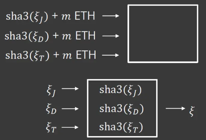 但是这样还不够,还有问题。假设此时Terry来了,这次他们一共三个人要决定一份蛋炒饭的所有权。多了一个人之后,Daniel发现事情有转机,他又想到了个主意:如果最后结果看起来不太妙,不是我吃的话,我就不进行揭示阶段直接假装晕倒。刚才的协议之下,我们实际上规定了只有所有人都输入的情况下,参与者才有输出结果。假如参与者承诺,但却没有揭示,那怎么办?是重新再来一遍,还是就取剩下两个人的输入呢?这两种方法是都有问题的:如果要重新来一遍,那么攻击者就可以通过这种方法在每次自己不利的情况下强行使得协议重新运行;如果只取剩下两个人的输入,攻击者同样可以选择是否放弃输入来趋利避害。因此,我们需要有惩罚机制来保证参与者不得随意放弃。当参与者在承诺的时候,必须要向协议上交一个比特币——如果是带有智能合约的区块链的环境,这样的操作十分容易。如果Daniel不按时揭示,那就没收Daniel的比特币分给Jan和Terry。由于蛋炒饭的价值通常并不会超过一个比特币,Daniel不会选择这样的方式进行作弊。这样的一个惩罚机制,就是为了防止拒绝服务攻击。