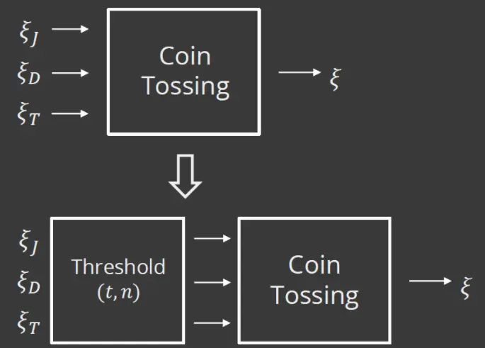 除了惩罚之外,还有另外一种方式,我们称之为集齐七颗龙珠才能召唤的蛋炒饭。简单来讲,就是之前的coin-tossing的协议,再追加一个门限机制。我们可以理解为对于拒绝服务这种攻击,我们增强了系统的健壮性,使得它能够容忍一定程度的拒绝服务。这样的门限机制总的说来有三种。