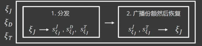 无分发者的秘密分享首先要分发,比如说Jan,把他的随机数分成三份,发给Terry和Daniel每人各一份。每个人都像Jan这样做之后,每个人手上都有3份来自不同的人,包括自己,的份额。此时,再把这些份额拼成份额向量广播给所有人,这样每个人只要手里有两份(包括自己的)这样的向量就能恢复出Jan、Daniel和Terry三人的随机数,然后就可以算出最终的随机数。而无分发者的公开可验证秘密分享,在分发的时候多了一些数据。这些数据就是proof。所有人通过收到的proof验证收到的份额。验证通过就可以说明这个份额确实和其他发出去的份额是一致的。