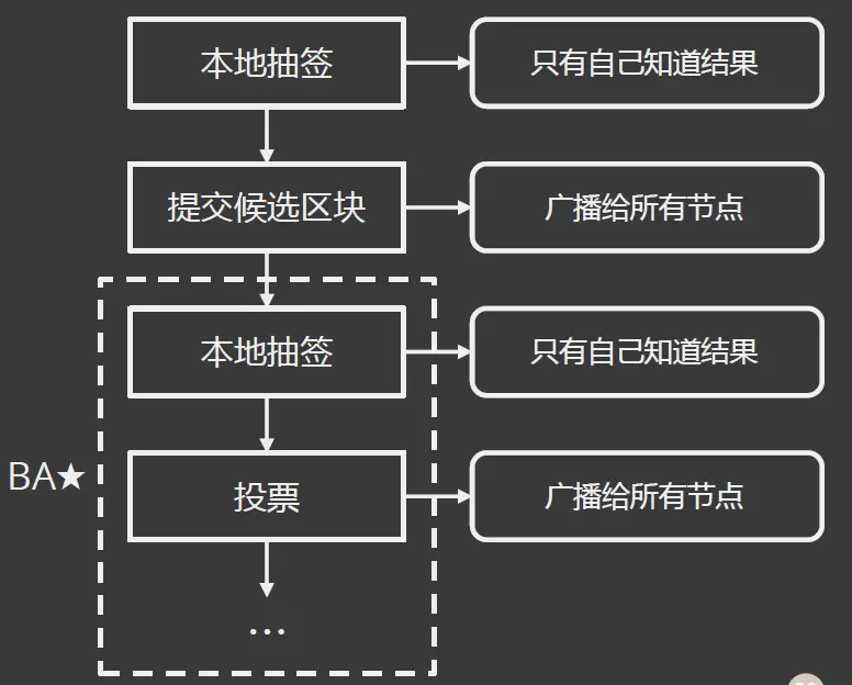 Algorand的共识过程利用了随机抽签,它的随机抽签所依赖的种子本质是通过取前t个输入来生成的。Algorand的共识过程要求节点先在本地抽签,通过一个Verifabale Random Function算出来一个可验证的确定的随机数,这样的随机数是根据上一轮的公共信息加上每个节点自己的私钥计算出来的,是唯一确定的,并且可被其他人验证。本地抽签后,每个人知道自己是否被选中。之后,被选中的人广播抽签结果、证明和候选区块到全网节点,根据区块的quality大小,选出来候选区块。而确定哪个区块的quality更大是需要做BA共识的,这个时候,就需要再进行一轮本地抽签,所有的节点会自己知道是否被选中去做BA*(一个拜占庭类型的共识),去投票选自己认为的quality最高的候选区块,投票会进行很多轮,每一轮都要重新进行一次本地抽签。可以看出,Algorand共识的本质就是我们每个人都生成一个随机数。但是我们最终只想要一个随机数,这样我们才能根据最后确定的随机数去决定哪个块会被全网接受。这个时候的方案就是根据某种确定的规则从众多备选结果中取一个,方法是通过拜占庭共识达成一致,这就是Algorand的核心思想。
