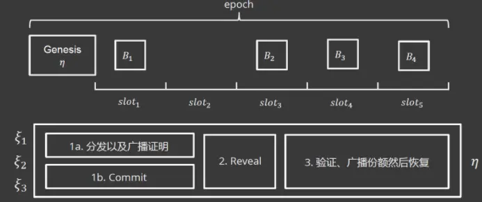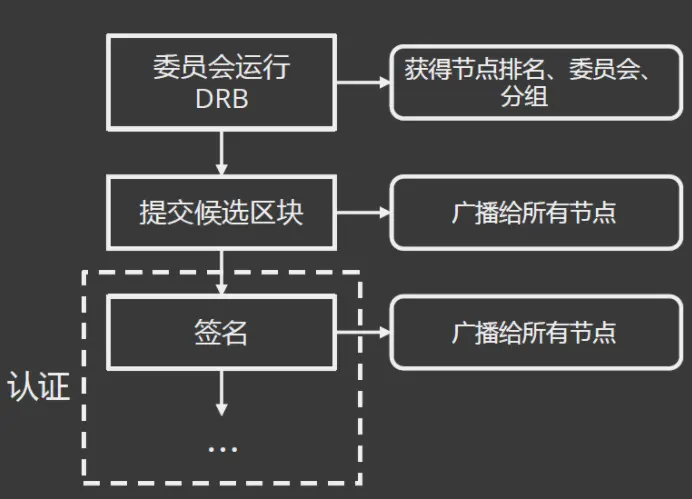 Dfinity。它的机制和algorand很像,也需要一个委员会,委员会会运行一个分布式的生成随机种子的协议。一样,我们先假设已经有了这样的随机数种子了,这样,随机数种子可以被利用算出每一个节点的排名。同时节点可以注册进入不同的组,不同的组中可以有相同的节点。委员会就是在这些组中随机挑选的一个,随机种子是刚刚提到的那个种子。此时,大家都可以提交候选区块,广播给所有的节点,但是在所有人做区块认证的时候,诚实节点总是会选择排名最高的块签名,签好后,广播给所有的节点,直到节点收到或拥有某个获得一半以上签名的区块。一轮的公共种子实际上是根据上一轮的种子以及开始设置的密钥对唯一生成的。其实就是无分发者的秘密分享加上门限签名的方案。