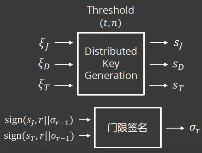 第三种方法是分布式密钥生成+门限签名。门限签名可以理解为秘密分享应用到了签名方案中,但是它又不是单纯将两者相叠加。通常的签名是,一个人用自己的私钥加密了消息之后,大家可以用公钥进行验证。而该方案使用的门限签名则是,同样有一对公私钥,但是每个人分别只有私钥的其中一个碎片;每个人可以利用自己碎片进行签名,这些签名可以被公钥的相应碎片验证;并且,这些碎片中的任意t个合起来可以计算出来一个可以被完整的公钥验证的签名。因此,这样的签名过程并不需要所有人参与,只需要n个人中的t个人的有效签名就可以了。而且无论是哪t个人,最后生成的签名是一样的。并且签名过程中涉及到的私钥不会被泄露,这使得多轮无交互签名成为可能。当然,这个总的公私钥对不是凭空出来的,它的生成需要所有人在一开始运行分布式密钥分发协议才能生成有这样的密码学特性的公私钥对。同时,这个方案还是存在必须要知道总人数的问题。