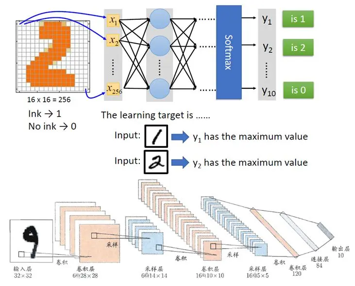 例如上面的例子,输入一个写着2的图片,输出的列表里面第二个数字最大,其实从机器来讲,它既不知道输入的这个图片写的是2,也不知道输出的这一系列数字的意义,没关系,人知道意义就可以了。正如对于神经元来说,他们既不知道视网膜看到的是美女,也不知道瞳孔放大是为了看的清楚,反正看到美女,瞳孔放大了,就可以了。