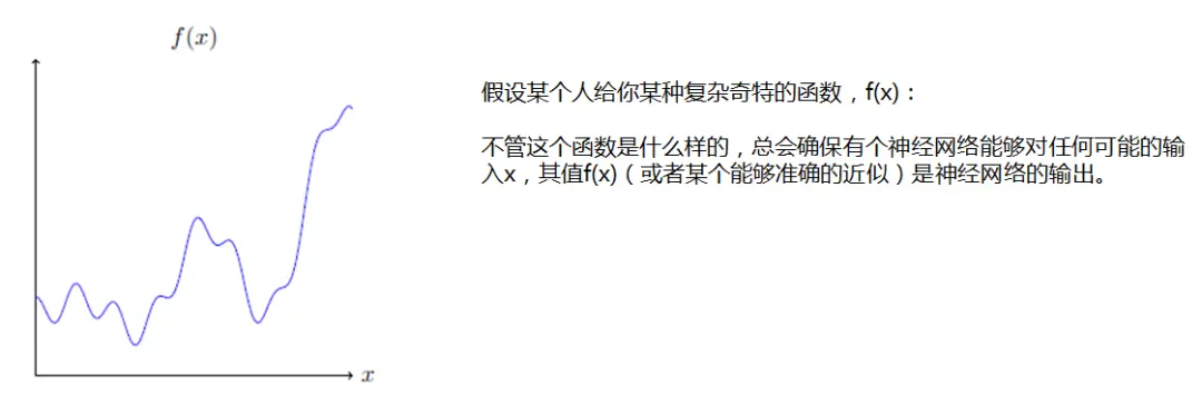 不管这个函数是什么样的,总会确保有个神经网络能够对任何可能的输入x,其值f(x)(或者某个能够准确的近似)是神经网络的输出。