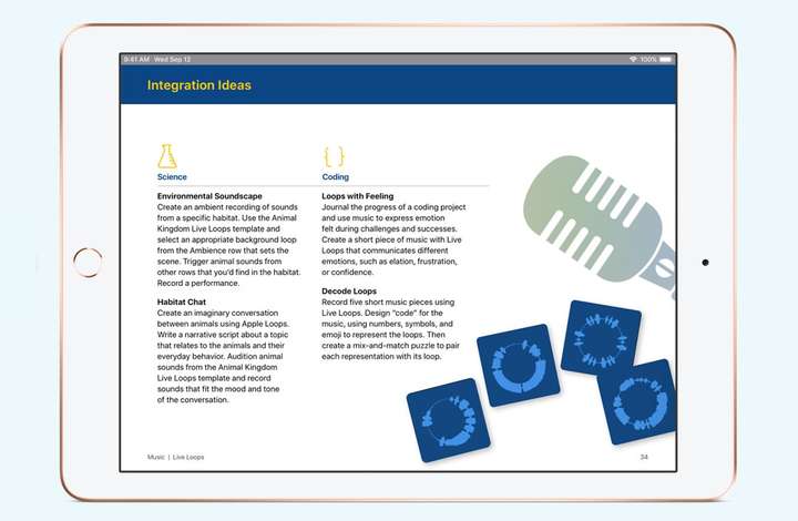 根据这套课程,学生们可以使用 iPad 上众多创造相关的 App,并搭配 iPad 的内置摄像头、麦克风、扬声器、多点触控显示屏和 Apple Pencil 实时地进行创作。