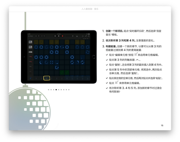以「音乐」指南为例,每当涉及到 iPad 上的操作,该课程都会通过具体的步骤解释和应用截图来详细地指引你完成,完全不用担心新手上路却不知所措的问题。