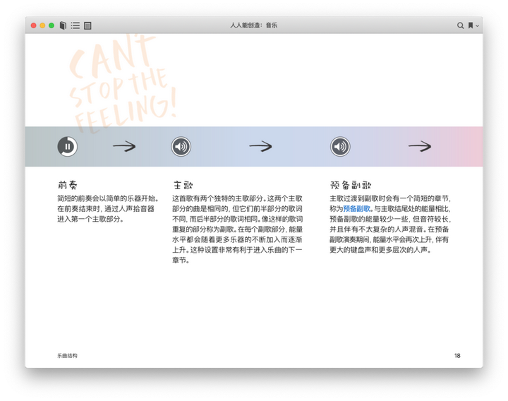 同时,你还可以在课程中听到各类音频,像在这个指南中 Justin Timberlake 的《Can't stop the feeling》就被拆分成前奏、主歌、预备副歌等部分,帮助你生动地理解乐曲的结构。