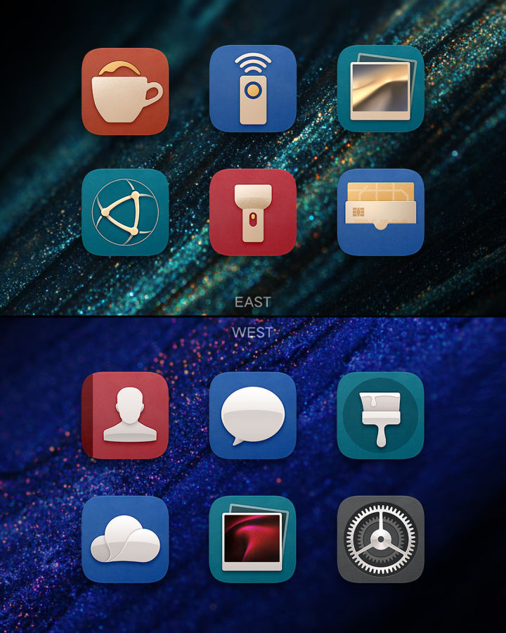 而「都市精英」系列图标则对华为原先的默认图标进行了重新思考,选择了更为平衡克制的三种基础色,并依据东西方的不同审美趋向,设计了冷/暖色的两套全新图标。