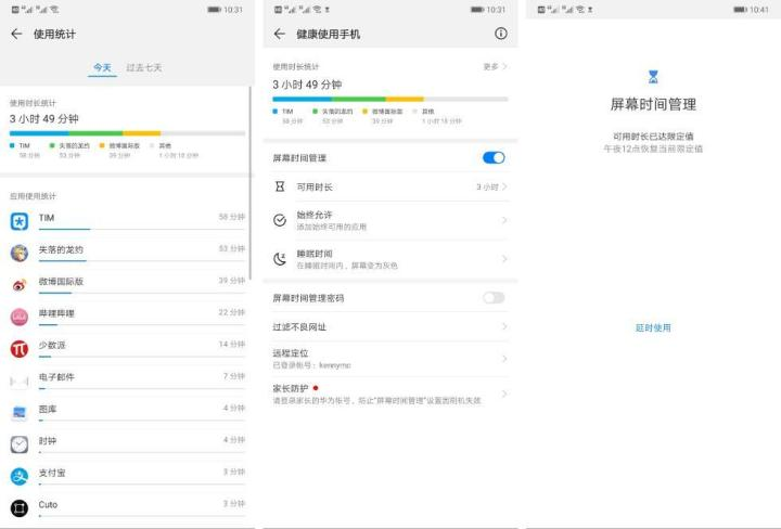 对此,EMUI 9 特地引入了一系列的新功能,帮助用户养成更健康的手机使用习惯。新增加的「屏幕时间管理」功能,能够记录你的应用使用时长,生成直观的统计数据;当你意识到自己过于沉迷的时候,还可以打开管理开关,对应用进行定时操作。