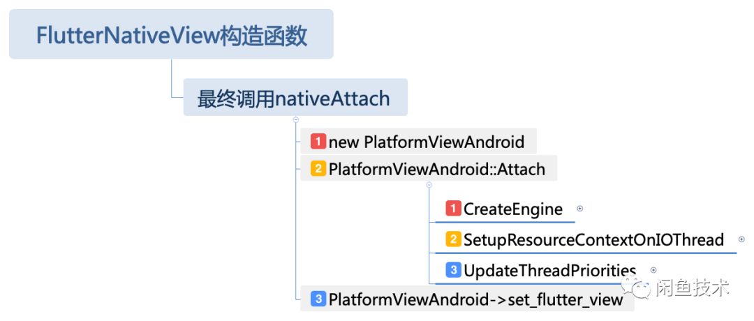 其中:1. PlatformViewAndroid的构造函数主要是调用了InitializePlatformSurface方法,这个方法主要是初始化了Surface,其中Surface有Vulkan、OpenGL和Software三种类型的区别。2. PlatformViewAndroid::Attach方法这里主要调用三个方法:CreateEngine、SetupResourceContextOnIOThread和UpdateThreadPriorities。 2.1 CreateEngine比较好理解,创建Engine,这里会重新创建一个Engine对象。2.2 SetupResourceContextOnIOThread是在IO线程去准备资源的上下文逻辑。2.3 UpdateThreadPriorities是设置线程优先级,这设置GPU线程优先级为-2,UI线程优先级为-1。