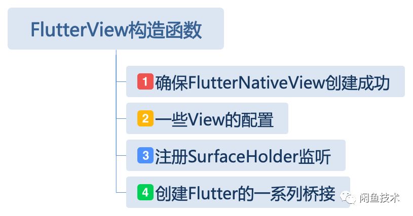 FlutterView的初始化就是纯粹的Android层啦,所以相对比较简单。分析FlutterView.java的构造函数就会发现,整个FlutterView的初始化在确保FlutterNativeView的创建成功和一些必要的view设置之外,主要做了两件事:1. 注册SurfaceHolder监听,其中surfaceCreated回调会作为Flutter的第一帧回调使用。 2. 初始化了Flutter系统需要用到的一系列桥接方法。例如:localization、navigation、keyevent、system、settings、platform、textinput。FlutterView初始化流程主要如下图所示: