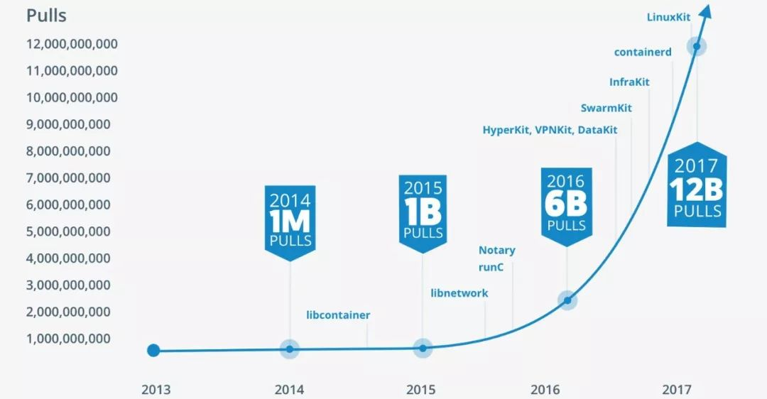 希望大家没有被文中众多的名称和概念搞糊涂,让我们以下图来结束本文,它展示了从2013年到2017年从Docker Hub拉取镜像次数的趋势: