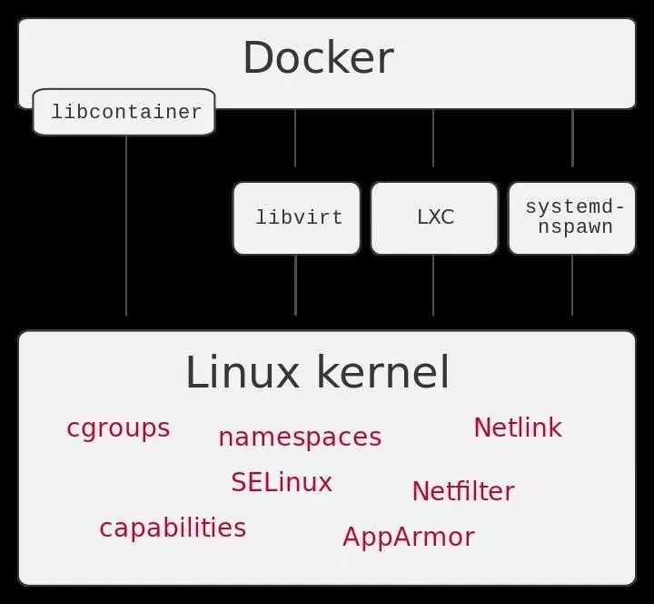Libcontainer为Docker封装了Linux提供的基础功能,如Cgroups,Namespaces,NetLink和NetFilter等,如下图所示: