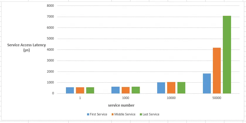 k8s集群创建大规模服务时,会产生很多iptables规则,非增量式更新会引入一定的时延。iptables规则成倍增长,也会导致路由延迟带来访问延迟。大规模场景下,k8s 控制器和负载均衡都面临这挑战。例如,若集群中有N个节点,每个节点每秒有M个pod被创建,则控制器每秒需要创建NM个endpoints,需要增加的iptables则是NM的数倍。以下是k8s不同规模下访问service的时延: