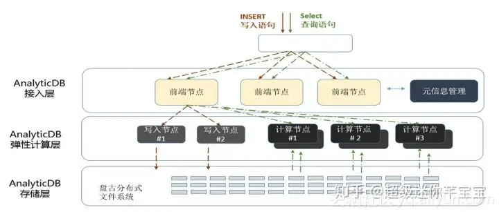 AnalyticDB 基于阿里云飞天系统构筑,AnalyticDB采用分层解耦架构,同时将分析计算、数据写入、索引构建等分离为不同节点,同时各种类型节点采用多活运行模式实现高可用,数据存储在盘古分布式文件系统上,实现高可靠和高性能读写I/O,在整体架构上实现了弹性扩展和高可用。AnalyticDB架构上每一层结构,都充分的考虑了规模化扩展性问题。
