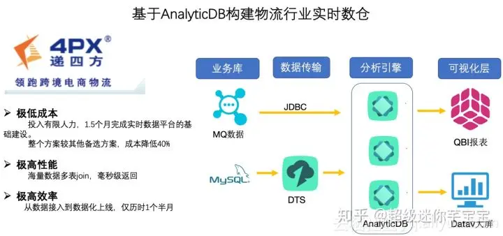 递四方集团(4PX)是领先的跨境电商物流服务提供商。递四方信息科技团队在建设了多年的离线数据平台后,需要短时间内建设PB级别实时数据平台支持数字化运营。递四方信息科技在调研了一系列的解决方案后,综合成本和建设效率等因素,最后选择了基于AnalyticDB来构建实时数据平台。 双方通力合作,在极短时间内通过DTS+AnalyticDB+DataV/QuickBI套件,以简单快速的拖拽配置方式完成了4PX企业实时数仓的初期基础建设。