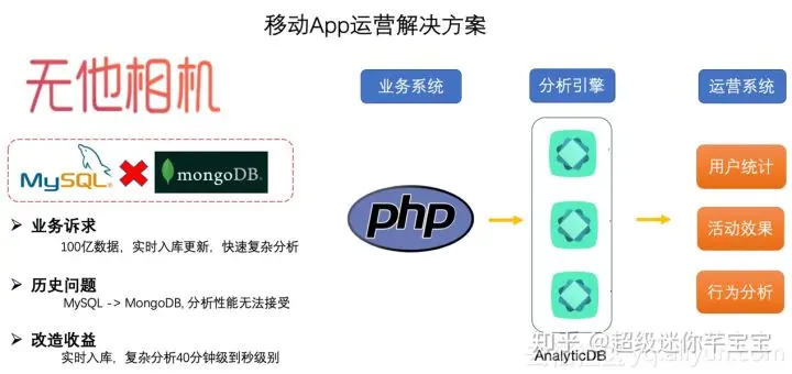 无他相机作为一款流行的拍照智能App, 有各种用户和App数据需要上报做实时分析,以帮助运营人员做活动效果分析以及开发人员做App分析,不断优化用户体验和App质量。数据总量约100亿,需实时入库更新,客户最早期的方案是MySQL,后续换成了MongoDB,解决了实时写入问题,但是分析性能巨慢。在使用了分析型数据库的存储型实例后,将业务数据直接写入AnalyticDB,不但解决了实时高并发写入问题,复杂分析性能从40分钟+降低到秒级别,高分期QPS 1800+。