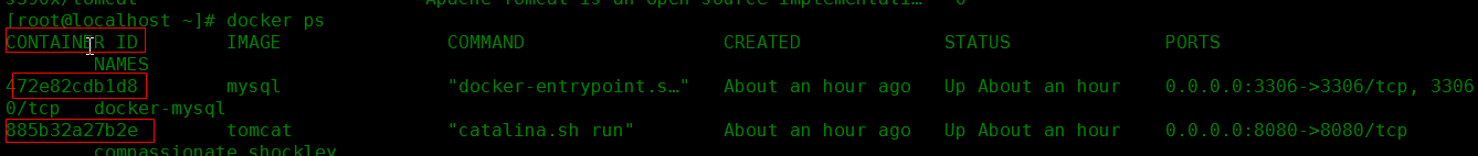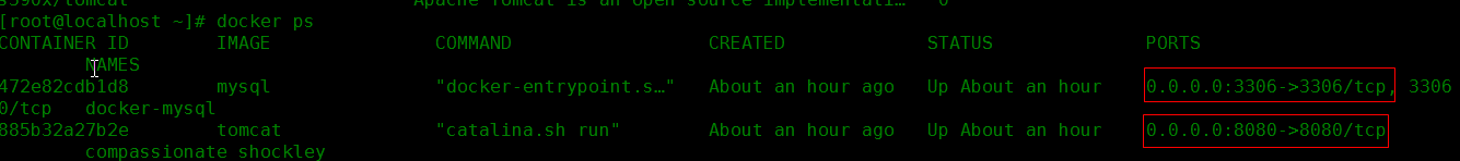 - 启动一个做了端口映射的tomcat [root@localhost ~]# docker run -d -p 8888:8080 tomcat -d:后台运行 -p: 将主机的端口映射到容器的一个端口 主机端口:容器内部的端口【下图红色标注即为主机端口与容器内部端口映射说明】