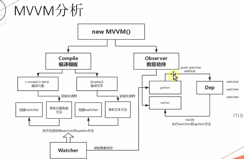 1.model影响视图:编译时注册watcher,在注册watcher,调用get,通过observer数据劫持get方法,将多个观察者统一管理起来。当改变数据时,调用set方法,将收拢的对应观察者的upadte方法更新。
