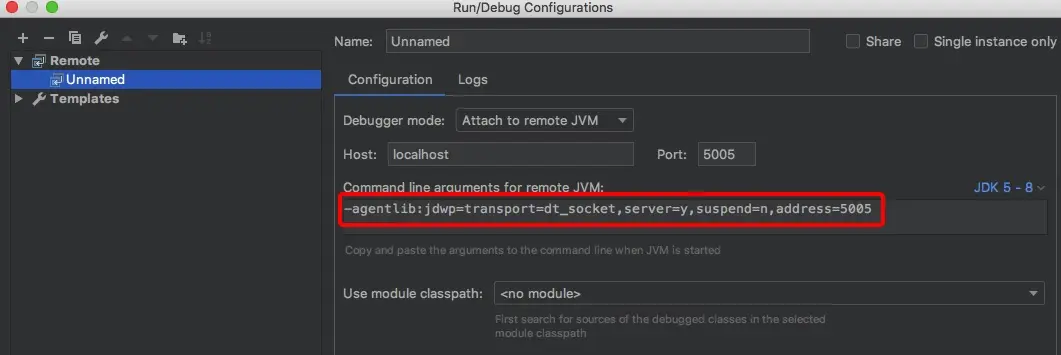 即 -agentlib:jdwp=transport=dt_socket,server=y,suspend=n,address=5005 其中端口号根据时间情况而定,如果要从启动方法里开始调试,则需要设置suspend=y