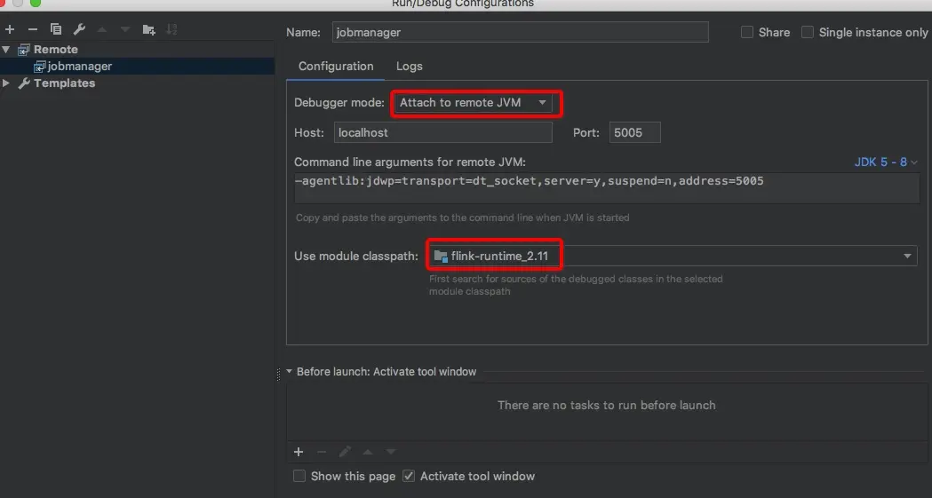 在flink-conf.yaml中添加: env.java.opts.jobmanager: -agentlib:jdwp=transport=dt_socket,server=y,suspend=y,address=5005 env.java.opts.taskmanager: -agentlib:jdwp=transport=dt_socket,server=y,suspend=y,address=5006