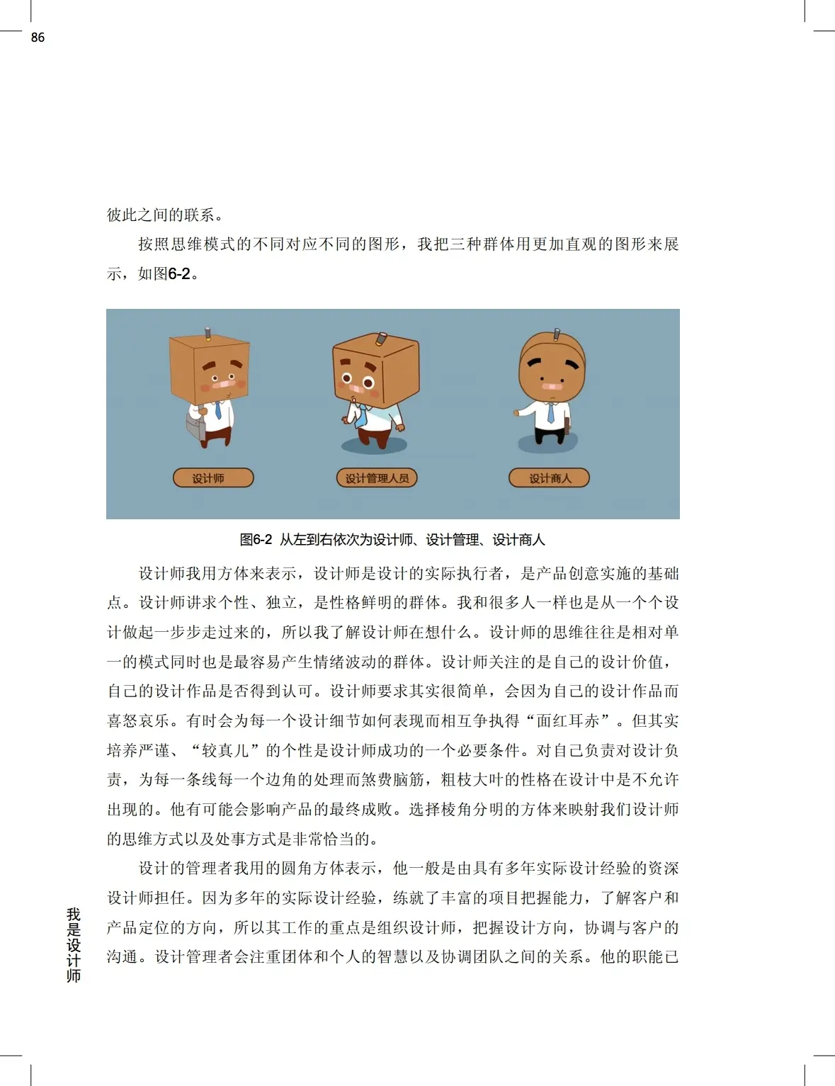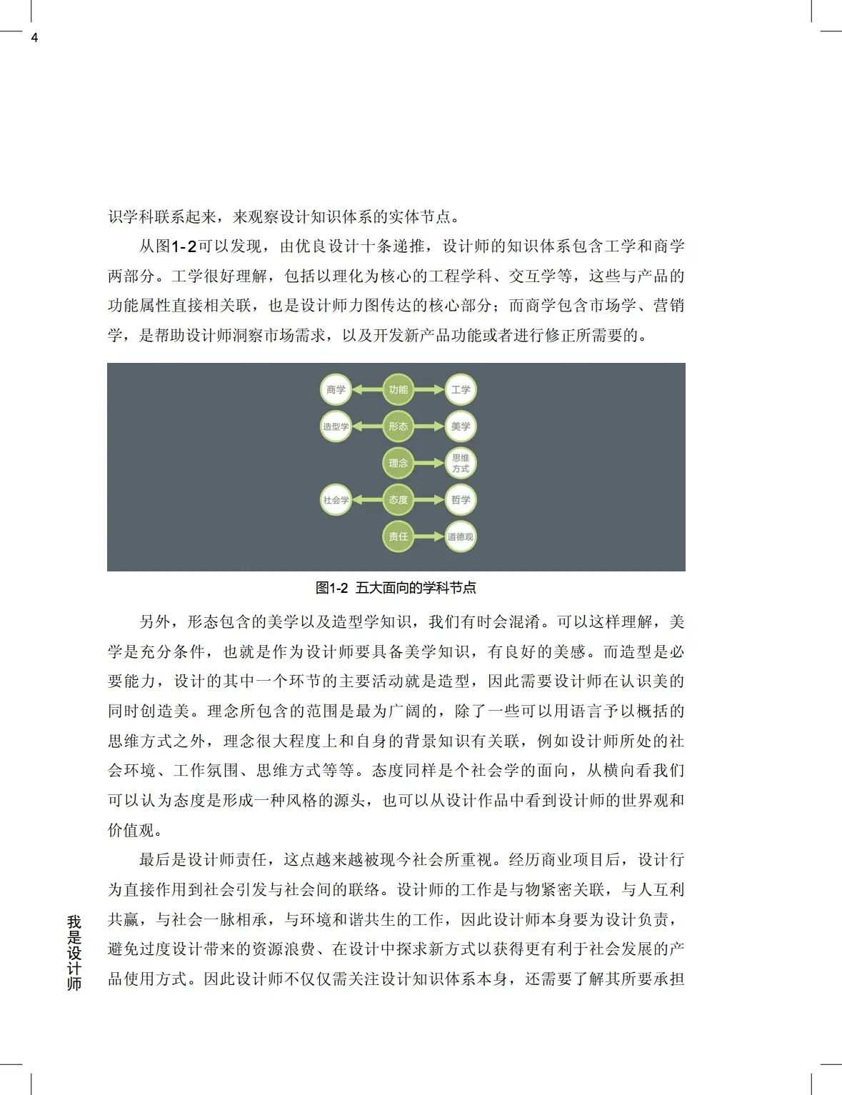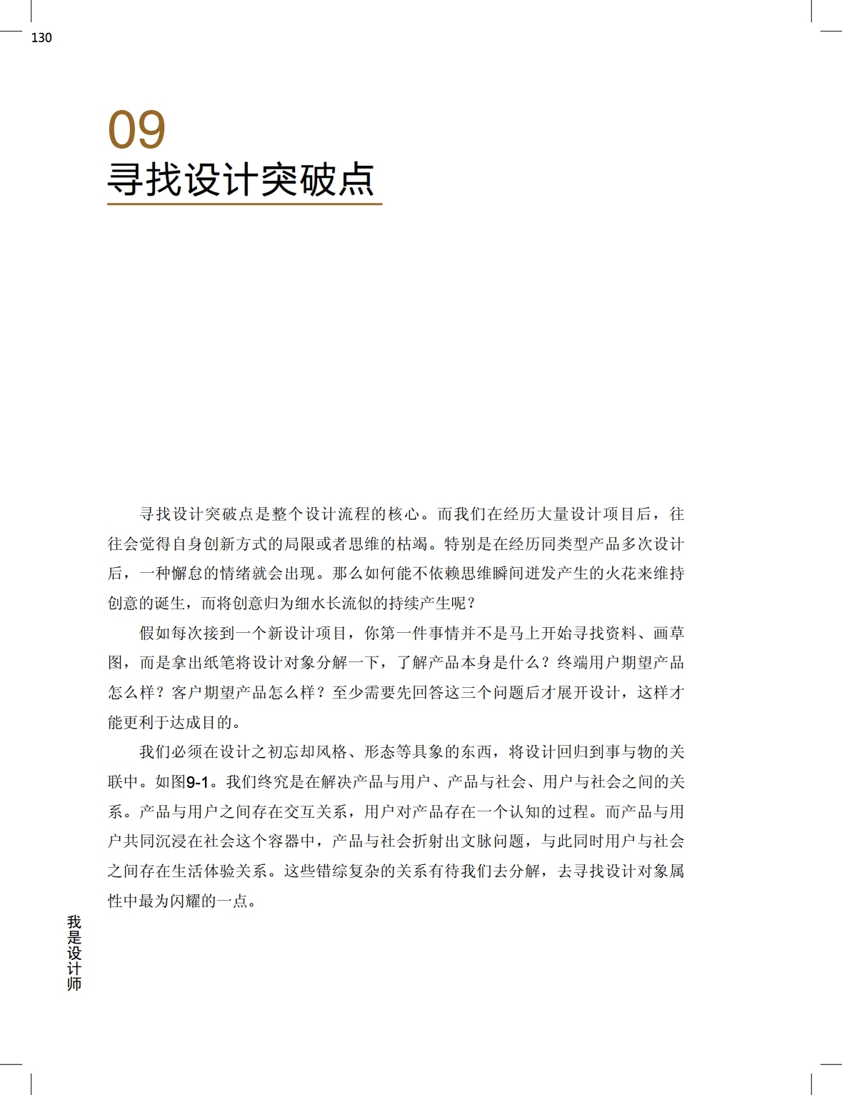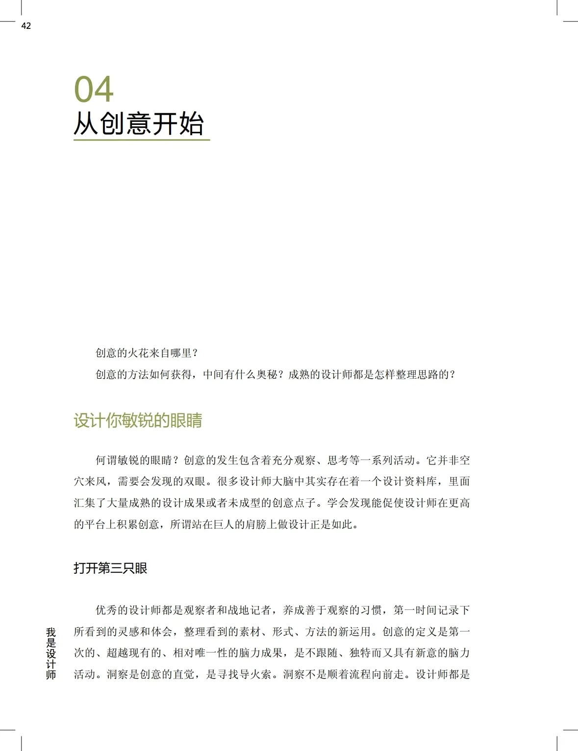 之所以想到策划这样一本书,是因为看到市场上讲设计软件使用技巧的书很多,却很少有讲设计本身的书。优秀的讲设计的书,几乎只有原研哉的《设计中的设计》这一本。原研哉大师的这本书确实堪称经典。唯一的问题是有些太“高”了,有些太“思想”和太“哲学”了。《易经·系辞》中有这样一句话“形而上者谓之道,形而下者谓之器”。原大师的这本书可以称之为“道”,那些海量的具体地讲解设计软件使用的书可以称之为“器”。这两种书市场上都有了,但由于这二者之间的距离实在还相距甚远。因此,要飞渡这二者之间的鸿沟,还缺一本“道”和“器”之间的书。这就是我策划本书的缘由。《我是设计师》,正是这样一本居于“道”和“器”之间的书。本书是针对即将入行的准设计师和入行未满三年的新人设计师而创作的。详细而具体的讲解了作为设计师,你需要看什么书,需要具备什么知识;如何才能产生绝妙的创意;如何规划你的设计职业生涯;接到一个案子后,如何一步步地完成它的设计;如何评估一个设计的优劣;如何找到设计突破点,如何不断修改和完善设计;等等。