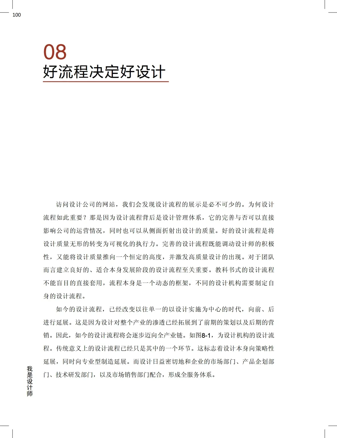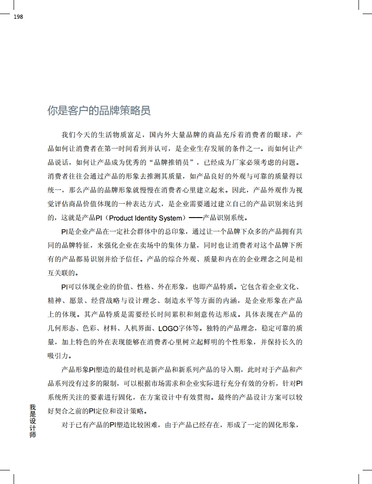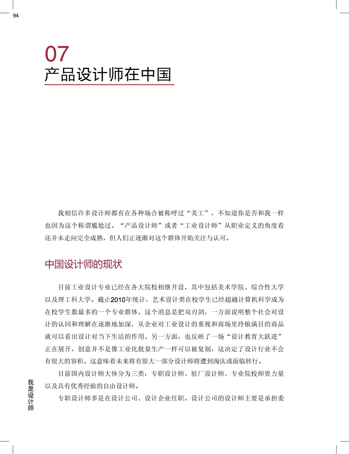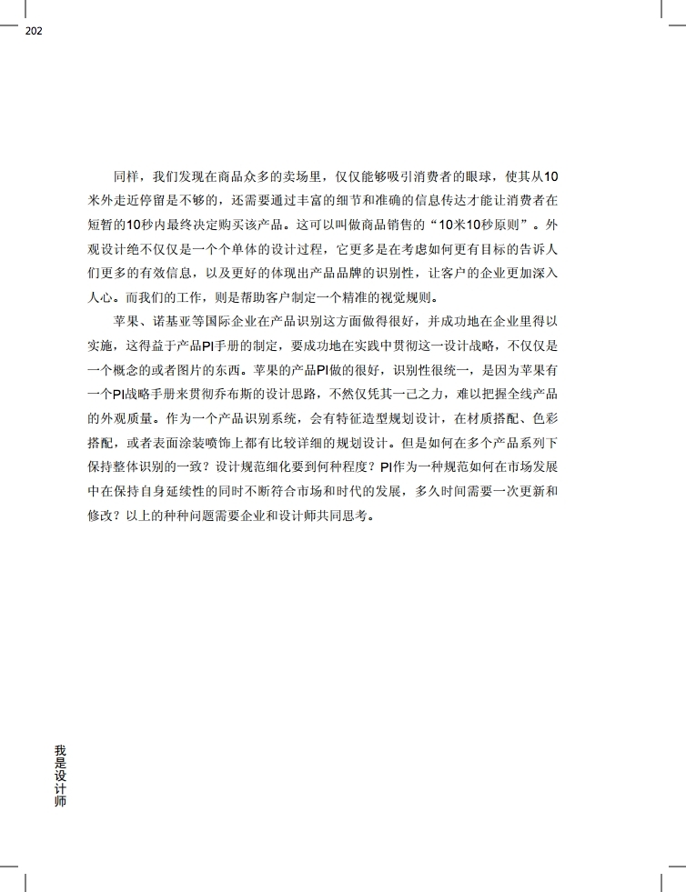 之所以想到策划这样一本书,是因为看到市场上讲设计软件使用技巧的书很多,却很少有讲设计本身的书。优秀的讲设计的书,几乎只有原研哉的《设计中的设计》这一本。原研哉大师的这本书确实堪称经典。唯一的问题是有些太“高”了,有些太“思想”和太“哲学”了。《易经·系辞》中有这样一句话“形而上者谓之道,形而下者谓之器”。原大师的这本书可以称之为“道”,那些海量的具体地讲解设计软件使用的书可以称之为“器”。这两种书市场上都有了,但由于这二者之间的距离实在还相距甚远。因此,要飞渡这二者之间的鸿沟,还缺一本“道”和“器”之间的书。这就是我策划本书的缘由。《我是设计师》,正是这样一本居于“道”和“器”之间的书。本书是针对即将入行的准设计师和入行未满三年的新人设计师而创作的。详细而具体的讲解了作为设计师,你需要看什么书,需要具备什么知识;如何才能产生绝妙的创意;如何规划你的设计职业生涯;接到一个案子后,如何一步步地完成它的设计;如何评估一个设计的优劣;如何找到设计突破点,如何不断修改和完善设计;等等。