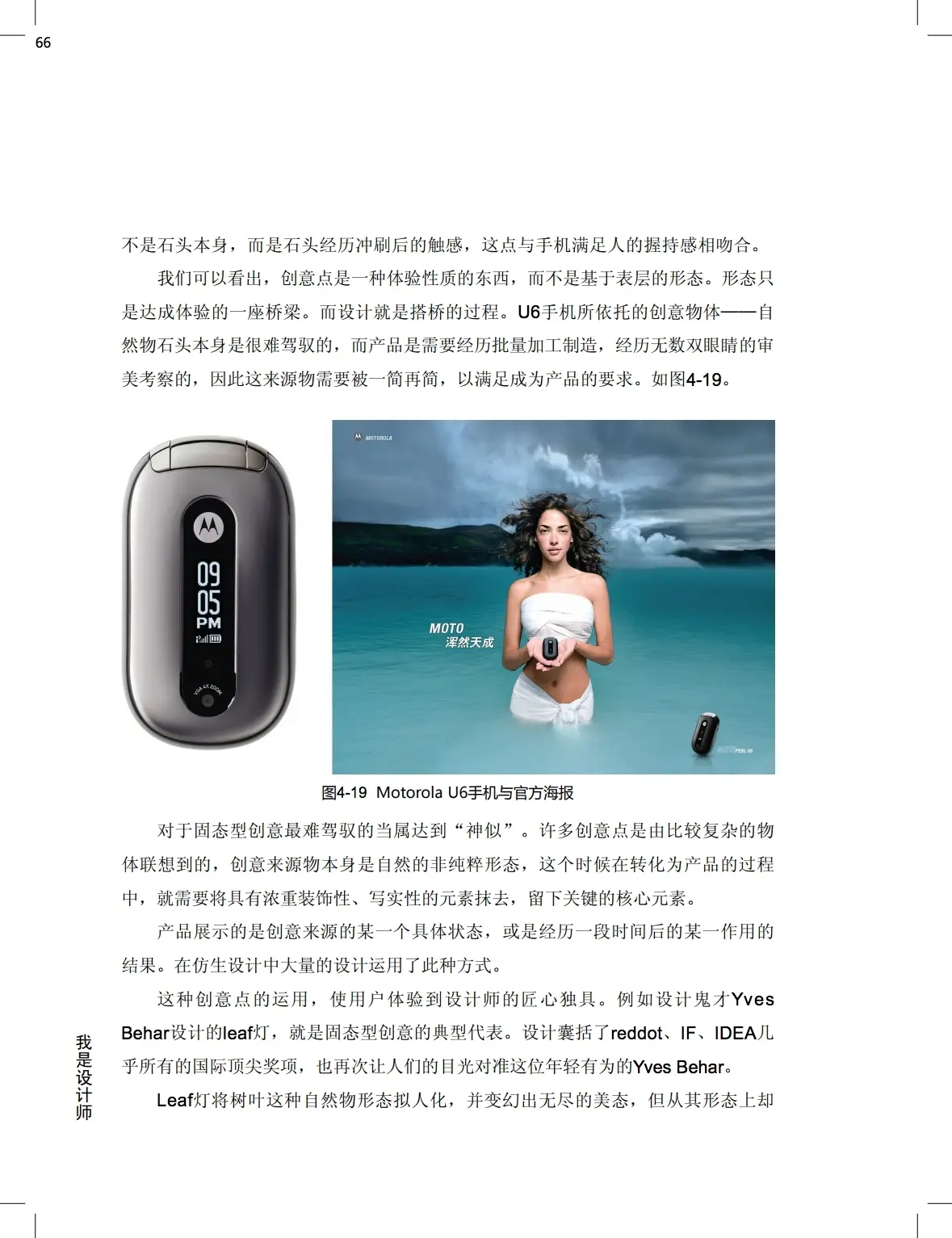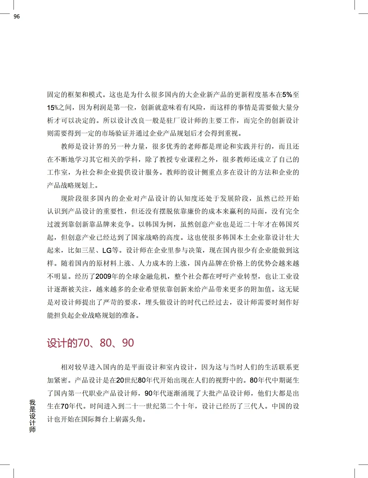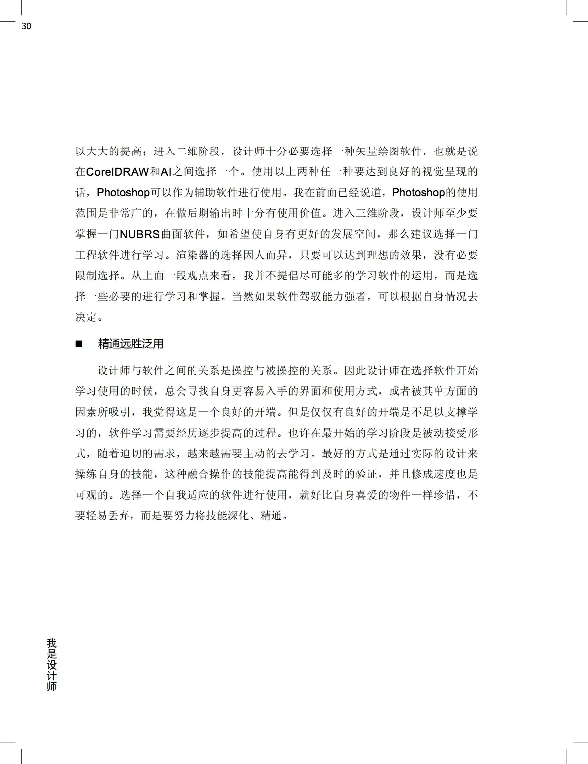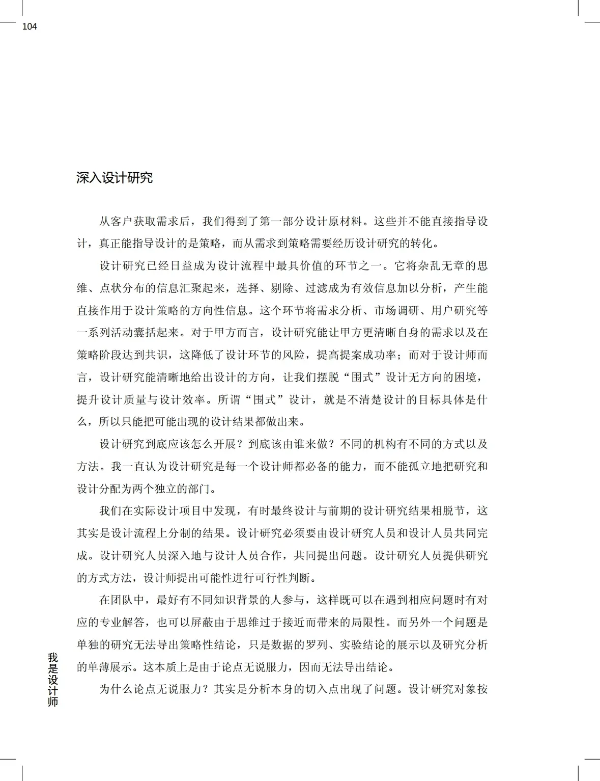之所以想到策划这样一本书,是因为看到市场上讲设计软件使用技巧的书很多,却很少有讲设计本身的书。优秀的讲设计的书,几乎只有原研哉的《设计中的设计》这一本。原研哉大师的这本书确实堪称经典。唯一的问题是有些太“高”了,有些太“思想”和太“哲学”了。《易经·系辞》中有这样一句话“形而上者谓之道,形而下者谓之器”。原大师的这本书可以称之为“道”,那些海量的具体地讲解设计软件使用的书可以称之为“器”。这两种书市场上都有了,但由于这二者之间的距离实在还相距甚远。因此,要飞渡这二者之间的鸿沟,还缺一本“道”和“器”之间的书。这就是我策划本书的缘由。《我是设计师》,正是这样一本居于“道”和“器”之间的书。本书是针对即将入行的准设计师和入行未满三年的新人设计师而创作的。详细而具体的讲解了作为设计师,你需要看什么书,需要具备什么知识;如何才能产生绝妙的创意;如何规划你的设计职业生涯;接到一个案子后,如何一步步地完成它的设计;如何评估一个设计的优劣;如何找到设计突破点,如何不断修改和完善设计;等等。