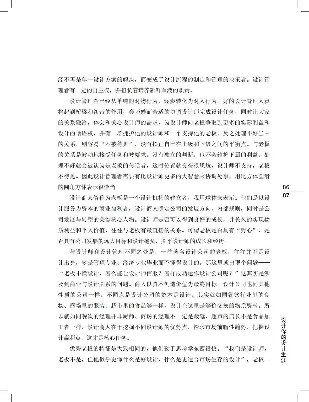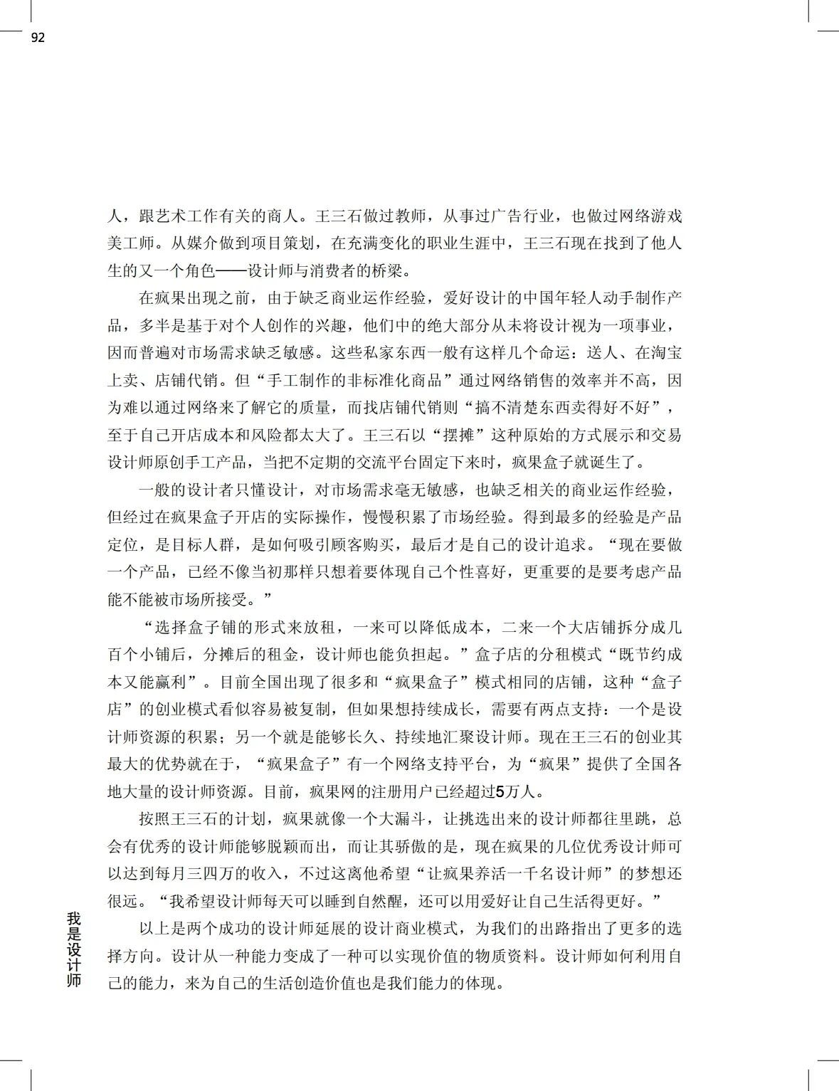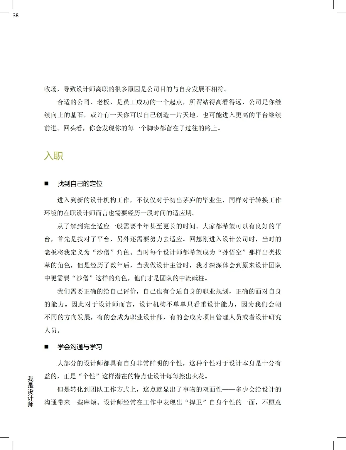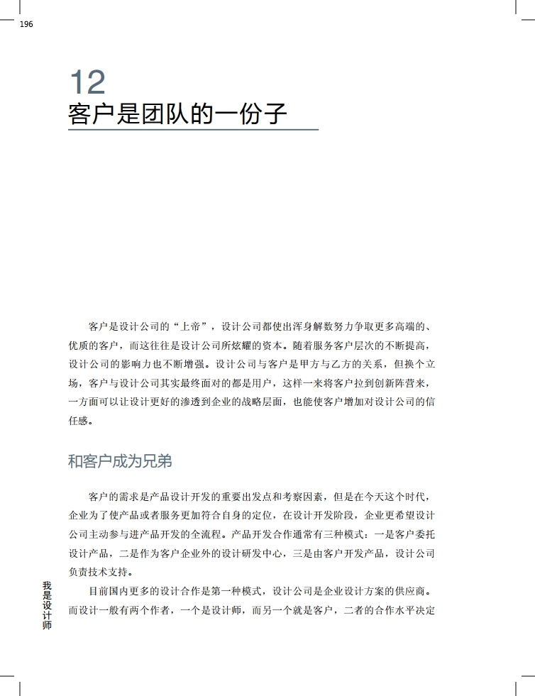 在书稿写作阶段,我们邀请了很多业界朋友来阅读书稿。通过此举我们获得了大量有价值的反馈意见,同时也得到了肯定。这让我们获得很大的鼓舞。随着写作的深入,更多好的建议被融合进来,自身的感悟也逐步深化。我从事设计行业将近10个年头。从最初因为技术差距而绞尽脑汁“偷艺”,到游刃有余应对接触的项目,经历了很多。自己涉猎的设计范围广了,思路也越来越交融。我从一个普通的设计系毕业生开始,历经设计师、设计主管、设计总监,到今天与合伙人李久太拥有一家规模不大但充满希望的设计事务所,其中饱含了丰富的故事。这不是一本鼓吹商业设计利润的书,也不是一本以某种设计价值观为基础的书,而是以设计作为一种职业,以设计从业者的视角与所有同我有相似经历的设计师或即将展开设计生涯的准设计师们一起真诚且自信的去分享经历和感悟。