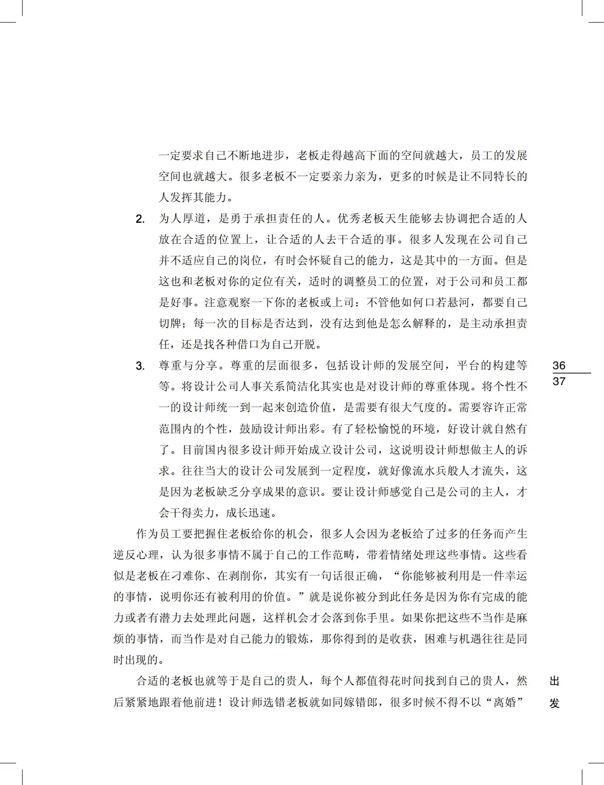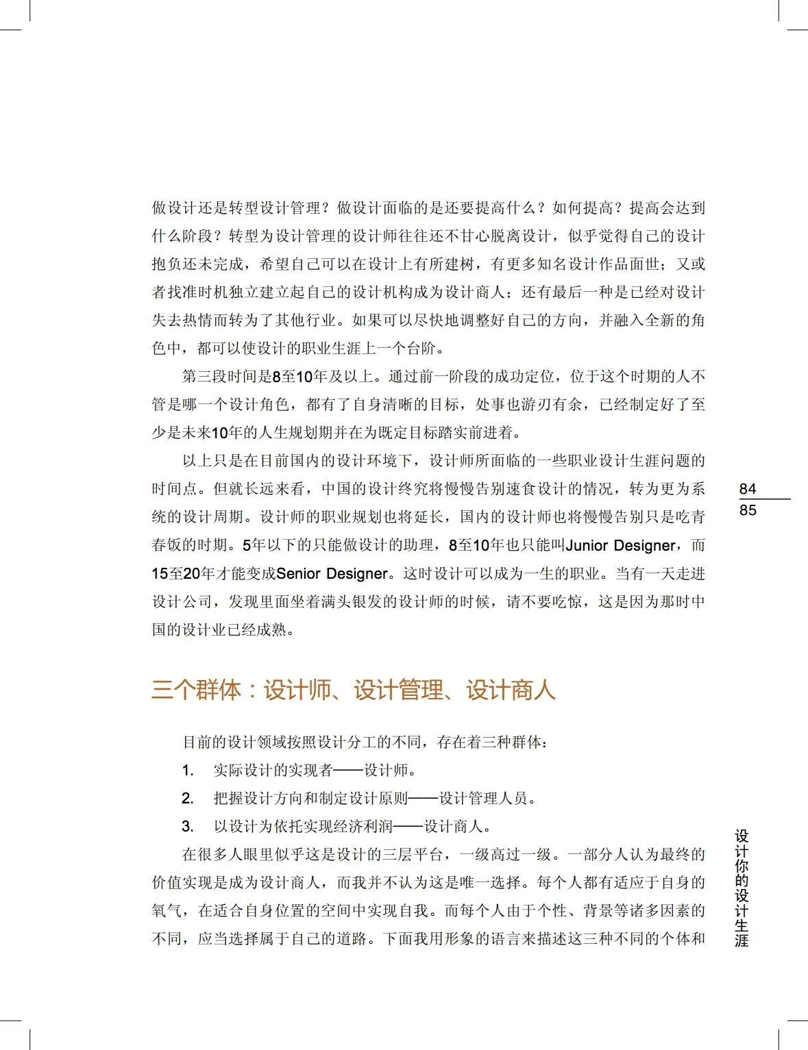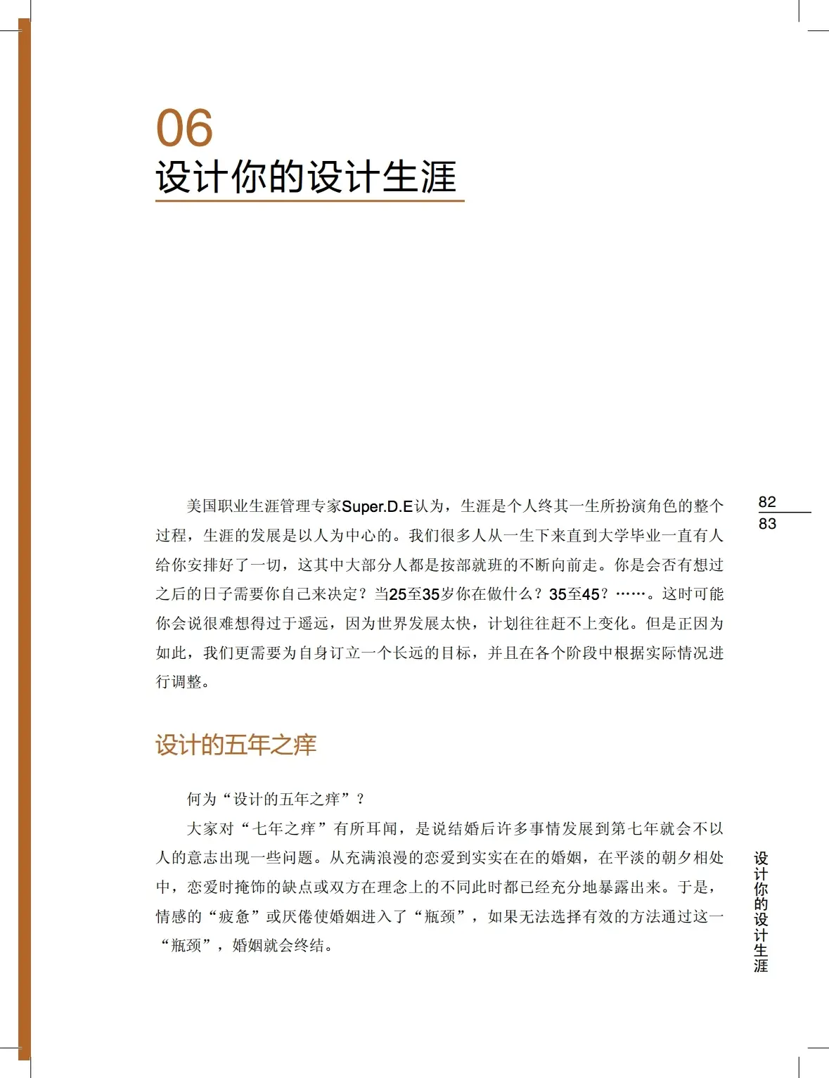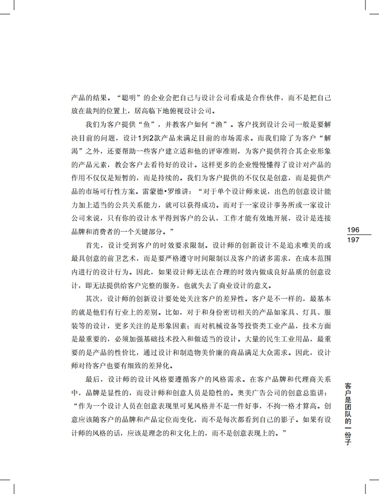 在书稿写作阶段,我们邀请了很多业界朋友来阅读书稿。通过此举我们获得了大量有价值的反馈意见,同时也得到了肯定。这让我们获得很大的鼓舞。随着写作的深入,更多好的建议被融合进来,自身的感悟也逐步深化。我从事设计行业将近10个年头。从最初因为技术差距而绞尽脑汁“偷艺”,到游刃有余应对接触的项目,经历了很多。自己涉猎的设计范围广了,思路也越来越交融。我从一个普通的设计系毕业生开始,历经设计师、设计主管、设计总监,到今天与合伙人李久太拥有一家规模不大但充满希望的设计事务所,其中饱含了丰富的故事。这不是一本鼓吹商业设计利润的书,也不是一本以某种设计价值观为基础的书,而是以设计作为一种职业,以设计从业者的视角与所有同我有相似经历的设计师或即将展开设计生涯的准设计师们一起真诚且自信的去分享经历和感悟。