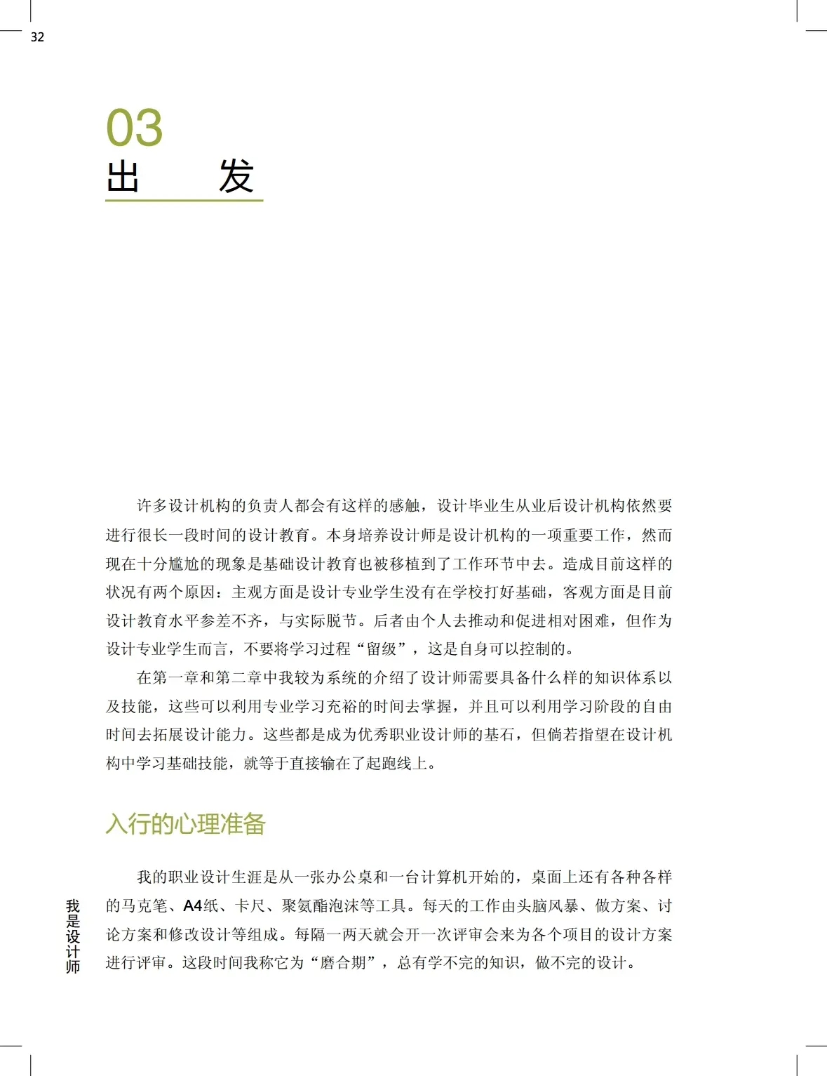 放下电话,静静地在想自己开始作设计师的这几年,一直在忙忙碌碌地为了每个设计和每个客户不断奔波着。是该找个机会让自己沉淀下,静静回头看看这些年自己的得失。于是很爽快地把此事答应下来。由于是结合自己的经历和设计感悟写此书。我便开始一边回忆自己毕业后的经历和设计中的感受一边拟定书的目录。