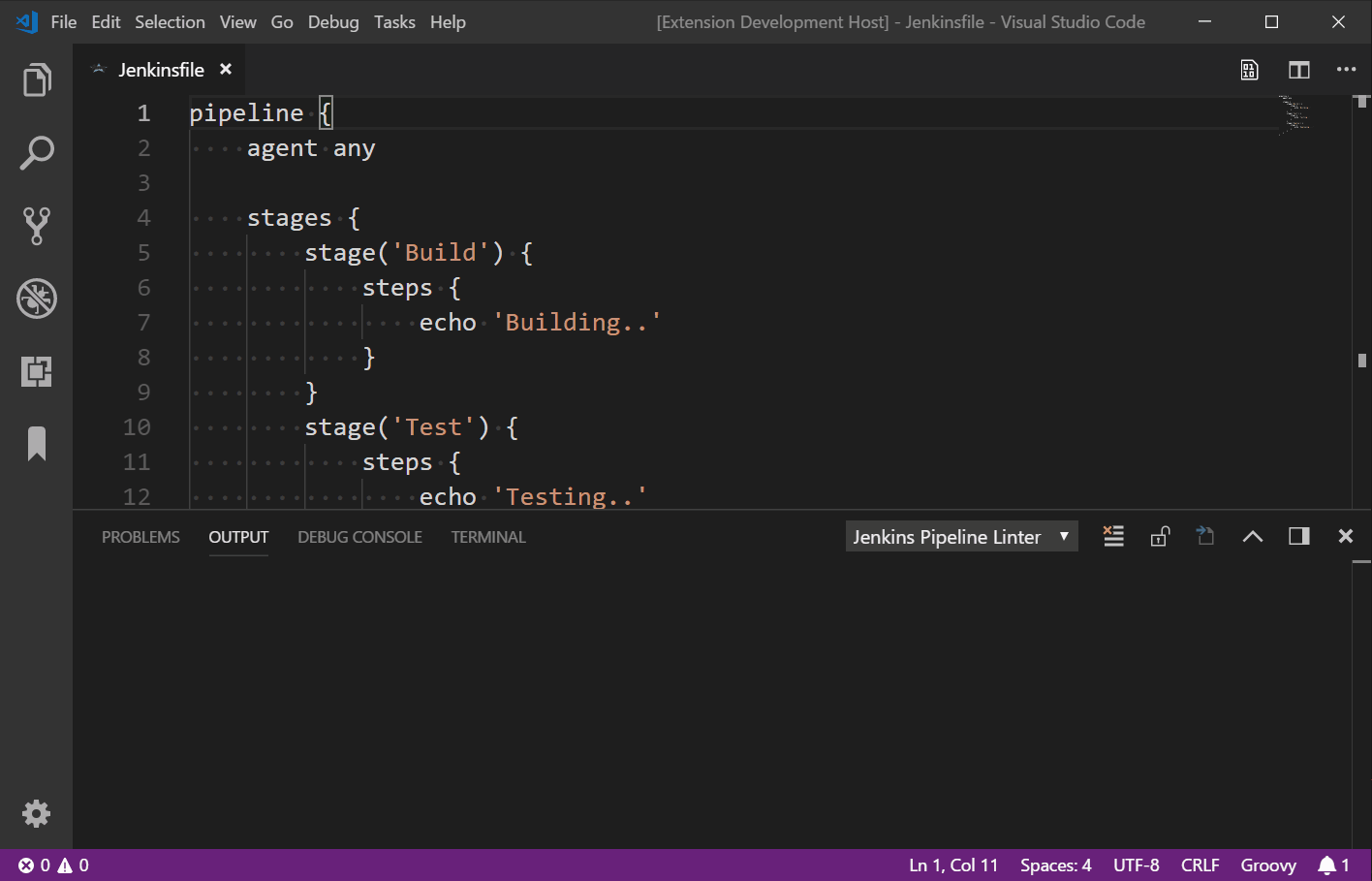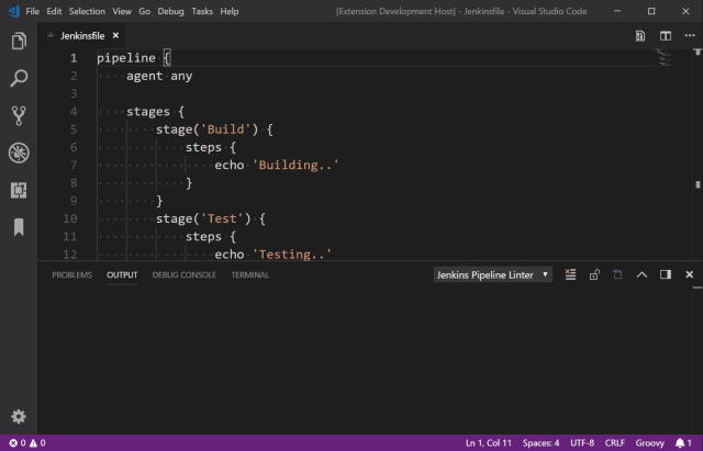 在日常工作中,我经常需要创建或修改很多 Jenkinsfile,有时还会发生错误。这是一个非常繁琐的流程——修改 Jenkinsfile,提交、推送,然后等 Jenkins 提醒你少加了一个括号。 Command-line Pipeline Linter(jenkins.io/doc/book/pi…) 可以有效地减少编写 Jenkinsfile 所需要的调试时间,但是它也有一些不方便的地方。你需要使用像 curl 或 ssh 的工具来连接你的 Jenkins,还需要正确地记住验证 Jenkinsfile 的命令。尽管如此,对我来说,这个方案还是不尽如人意。 鉴于每天都会使用 VS Code,于是我开始着手为此研发插件,使得校验 Jenkinsfile 变得更加友好。 Jenkins Pipeline Linter Connector 的作用就是,把当前打开的文件推送到你的 Jenkins,然后在 VS Code 中显示校验结果。