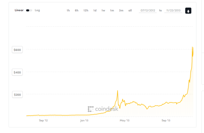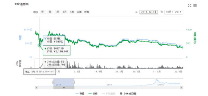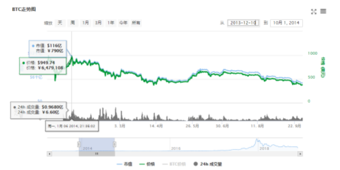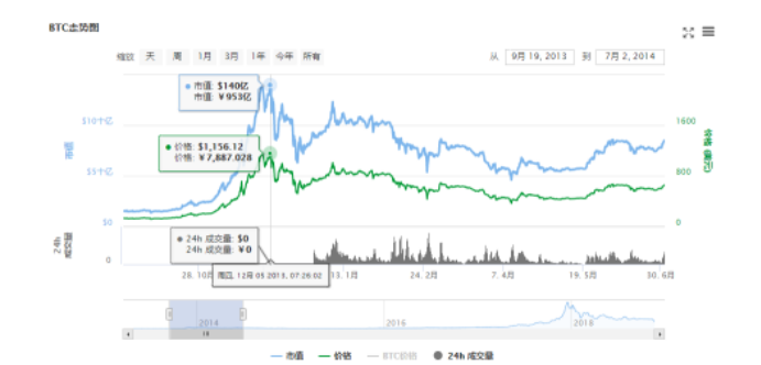 2013年11月起比特币的价格突然一路飙升至1156美元的高点。 然而,到了十二月中旬,直线跌至467美元,这个价格暴跌超过了55%。从10月31日开始上涨,到12月5日这天到达顶点,历时36天,随后直线下降,在12月18日降到最低点,用时13天。