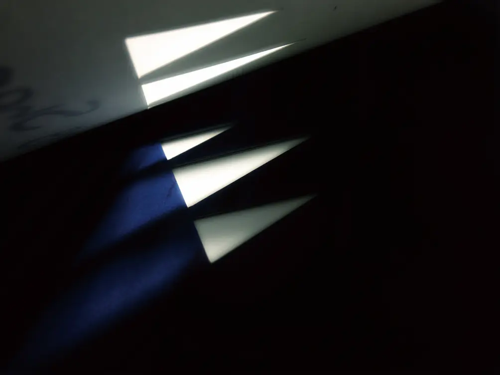 书的结构我做了斜切处理,一个纯白色封面,加上整本书的体量,我希望它出来的状态就是像这样子,有点像一个小小的雕塑,我希望它是一座巍然挺立的雪山,纯白色的。但我们可以看到它是比较尖锐的,有雪山的那种险峻感,书籍的形态也是用来迎合这个想法的。封面上没有任何的信息,只有三个三角形,而且是锐角三角形,它组合成一个雪山的山字,同时它是镂空的,翻开来之后,就是这样一个状态。它透过光线会把三角形组合成的山字投射在扉页上面的幽蓝的颜色上面,这个幽蓝的颜色,就是夜晚的“雪山”会呈现出的一种幽蓝的色彩状态。翻开后投射的光线有点像雪山上面影射出来的月光。