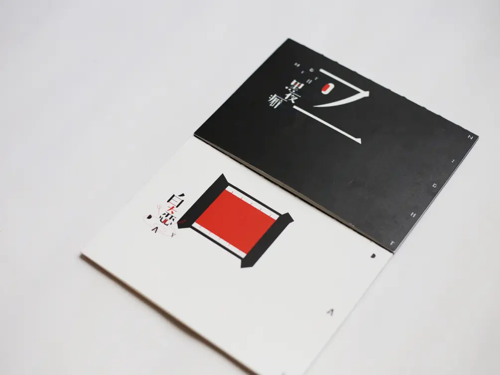 另外一个学生做的一本书叫《黑白癖》,这个是一本相当日常的书,就是记录自己白天黑夜的一些小癖好,她用胶袋把书封装起来,分为两部分,一边是白一边是黑。剪开之后我们打开这本书就像是开启了一包零食一样,非常轻松的我们就把这本小说拿出来阅读了,就像我们看着电影打开一包薯片一样简单。打开之后,书是双向的,一边是白天,一边是黑夜,两个状态,通过插画、文字去讲述她晚上经常失眠的状态,那么在字体和图形之间,也会形成某些表情,比如说像数绵羊、睡不着,和图形之间的造成了一个好像很困的这么一个表情。