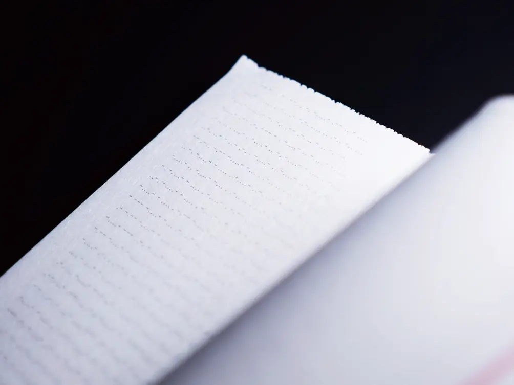 整本书的内容是收集了古今中外部分的爱情诗或者爱情主题的文本。文字内容以不同的形式,信件的形式、插页的形式或是正常的排版形式去呈现。分享一个编辑上的小细节,我们另外一边的翻阅位置放的是摩斯密码,大家都知道摩斯密码吧?就是特务之间的通信密码。我觉得恋人絮语,就是像密码一样,没有旁人听得懂恋人间在讲什么,是只有恋爱者之间才懂的语言。所以我们在另外这边放置的所有内容就是右页所有的情诗翻译过来的摩斯密码,而所有的摩斯密码的获得,都是把这些情诗放在网络上面进行摩斯密码的转译之后,呈现在页面上面。