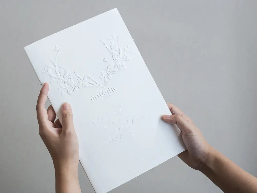 接下来是一本商业的画册,这本商业画册是一个服装品牌的委托。这个是帮他们的秋冬发布会做的一本服装的发布册,封面用浮雕工艺做了一些冬季的图形元素。这本书在内容规划上,分为两个章节,一部分是服装大片,一部分是服装信息,所以我们以两边翻阅的形态去呈现。从原来的大8开改造成16开的开本,我的考虑是这种服装的商业画册可以放在店里供客户去翻阅,我希望他们在选购的过程中,可以信手拿起来翻阅。像之前也就是他们原来的那个开本设置是不容易做出这么一种动作的,这也是通过观察阅读者群体的行为习惯而做的开本及翻阅行为设计的考虑。