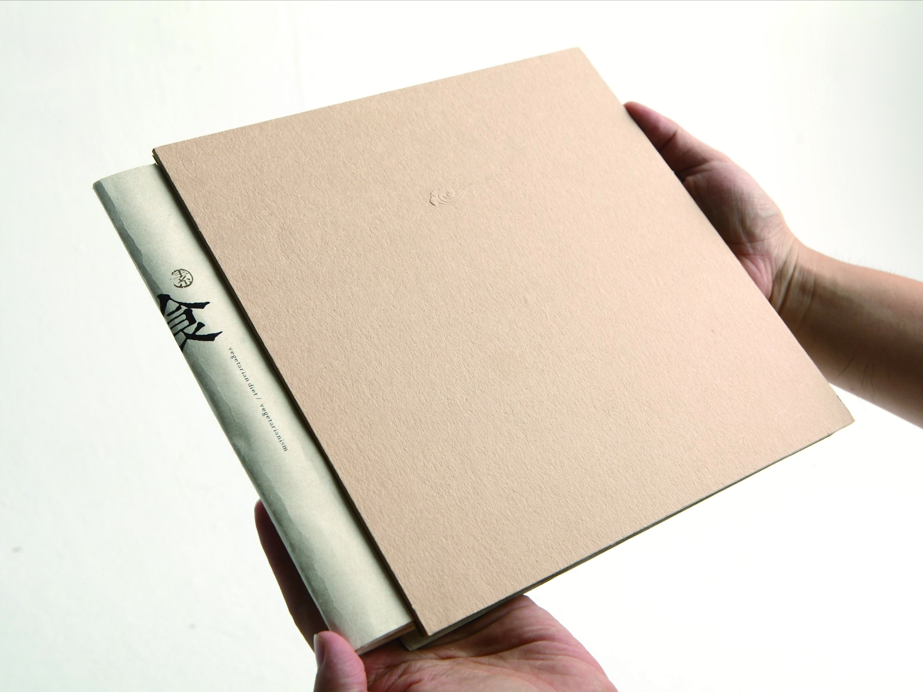 第一件作品叫《素食》,是一件自出版的书籍设计作品,我们刚刚看到这个封面,感觉它是一本精装的书,但其实细看它采用的是骑马订,封面前后各裱了一层厚版。书的主要内容是素食文化,在这个自出版物中,封面上几乎没有任何的平面设计的信息,使用凸版工艺做了一个图形。